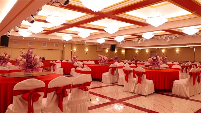 鉑金大廳—色彩濃烈,現代式裝修,面積560㎡,層高6米,開合大屏配合舞美燈光,唯美震撼,可承接30桌的中型宴會;12米長的可移動T臺收起后,就變成了可容納400人同時落座的大型多功能會議室。
